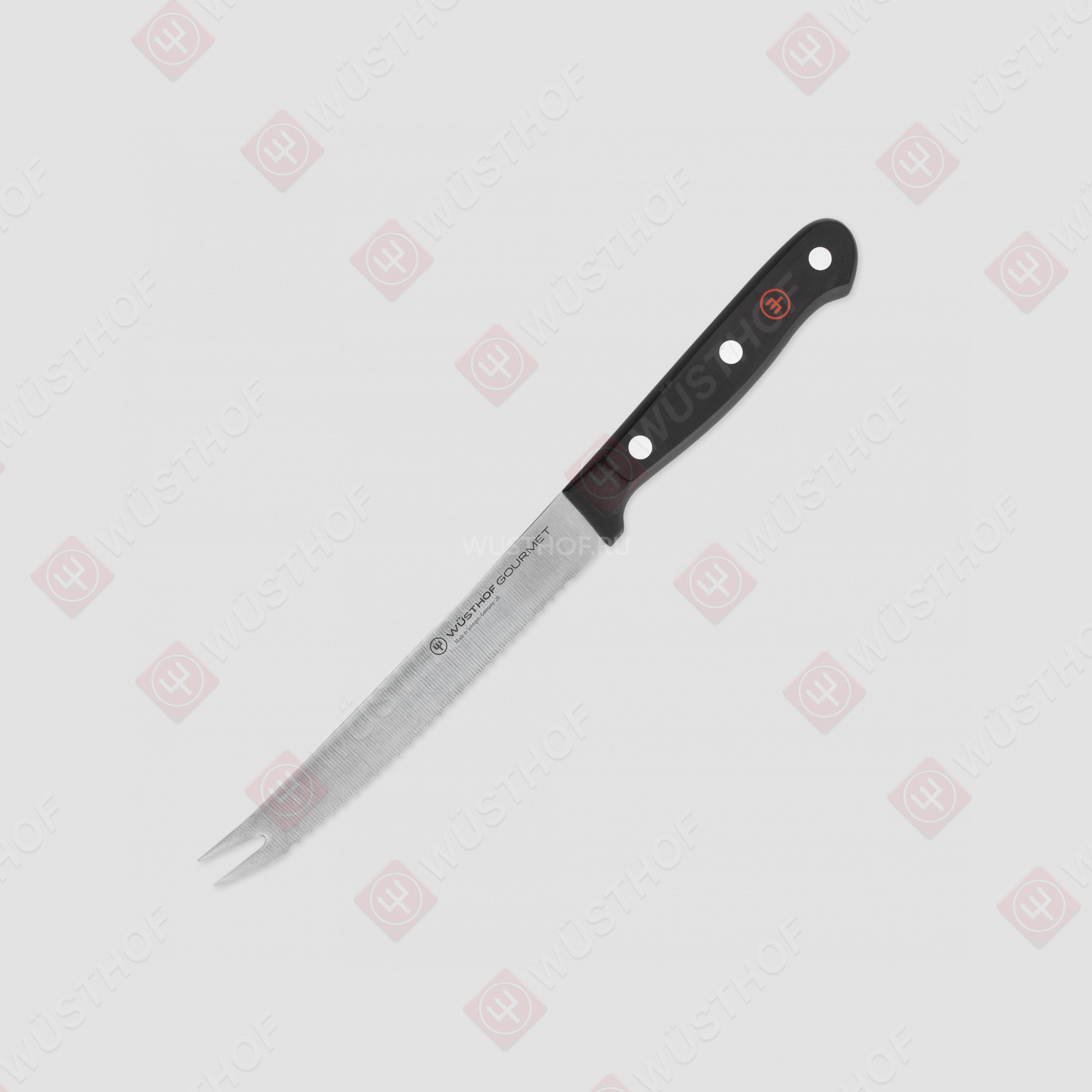 В серию кухонных инструментов Gourmet вошли ножи с клинками из прокатной высоколегированной стали X50 CrMoV15 и рукоятьми из ударопрочного синтетического материала. Рукояти ножей имеют эргономичную форму, большинство моделей – расширение в виде упора на краю рукояти у лезвия и развитую заднюю головку. К хвостовику клинка рукоять крепится двумя или тремя мощными заклепками.